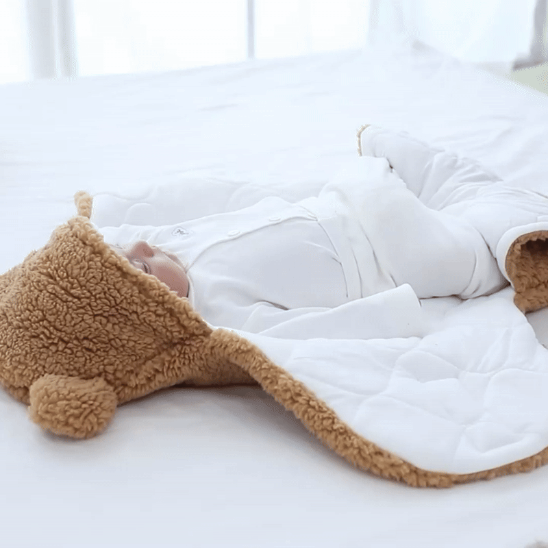 The CozyBear Sleep Wrap features a plush, teddy-soft outer layer and a soft cotton-based inner layer, with a lightweight padded middle for warmth and comfort.